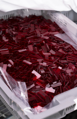 Dosimètres en plexiglas fabriqués en PMMA sensible aux rayonnements qui utilisent la densité optique pour mesurer la dose de rayonnement absorbée. La gamme de doses fonctionnelles est de 5 à 50 kGy.